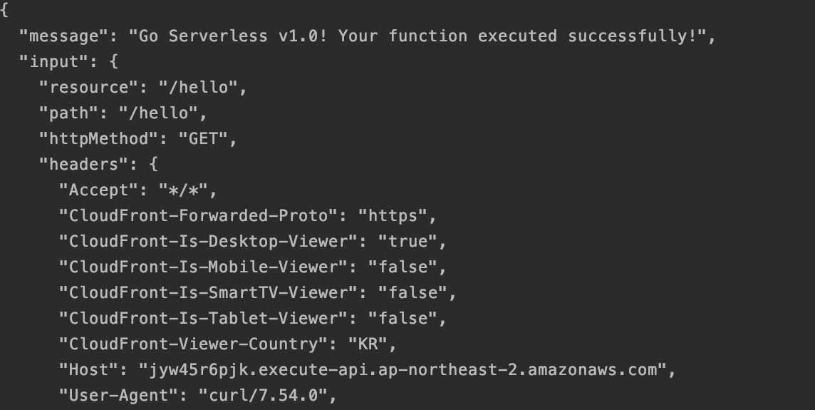 curl https://jyw45r6pjk.execute-api.ap-northeast-2.amazonaws.com/dev/hello아래와 같은 리턴 값이 돌아옵니다.