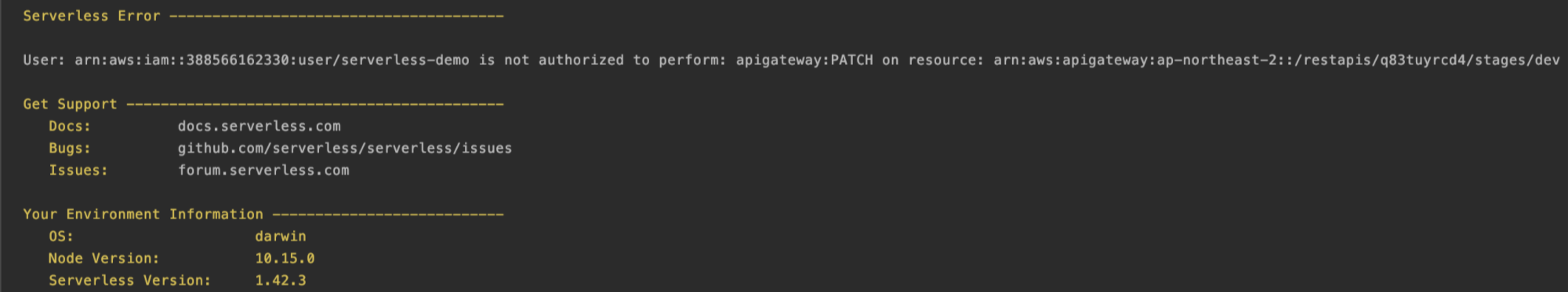 내용을 읽어보니 apigateway:PATCH 권한이 없어서 생기는 문제입니다.
