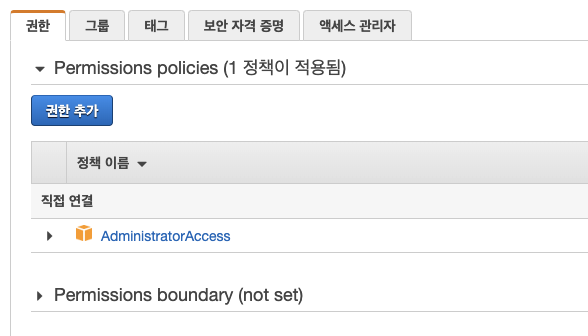 해당 사용자를 클릭하면 아래와 같이 AdministratorAccess 권한이 설정된 것을 확인할 수 있습니다.