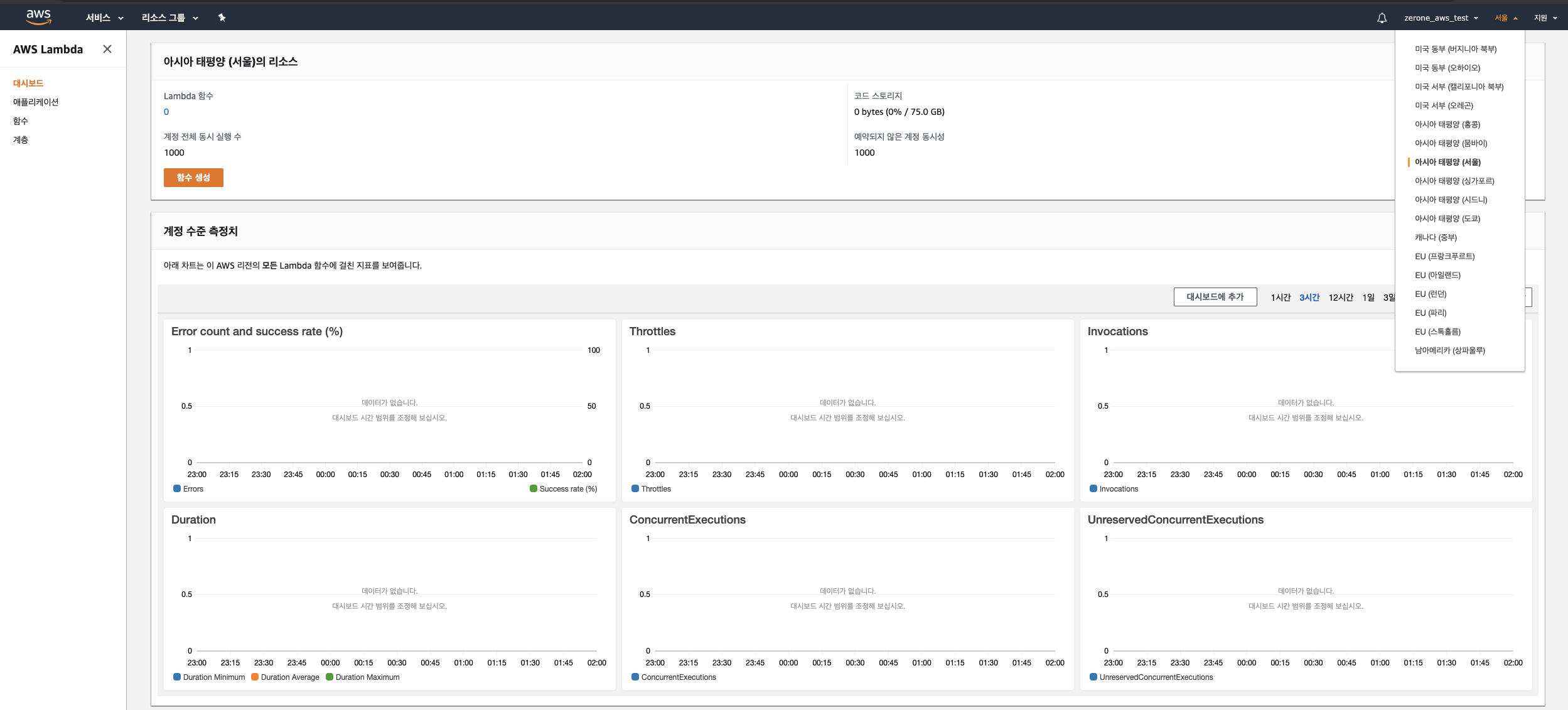 1. 람다를 클릭해서 들어간 다음 region을 서울로 설정