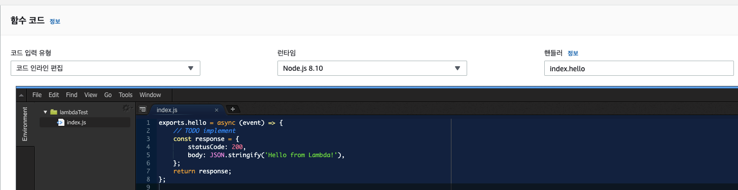 hello로 함수 이름 변경 exports.hello = async (event) => { // TODO implement const response = { statusCode: 200, body: JSON.stringify('Hello from Lambda!'), }; return response; };요로케 생겼는데 문서를 읽어보니 람다 함수는 기본적으로 handler 객체를 통해 호출된다고 합니다.