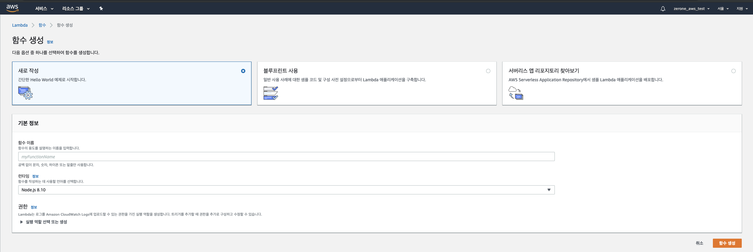 하지만 저는 새로 작성 하겠습니다. 왜? (개발자 특, 자기가 다 만들어보고 싶음). Node로 할꺼니깐 node 버전은 8.10 선택! 밑에 권한 설정하는게 있는데 기본 Lambda 권한으로 세팅해주면 됩니다.
