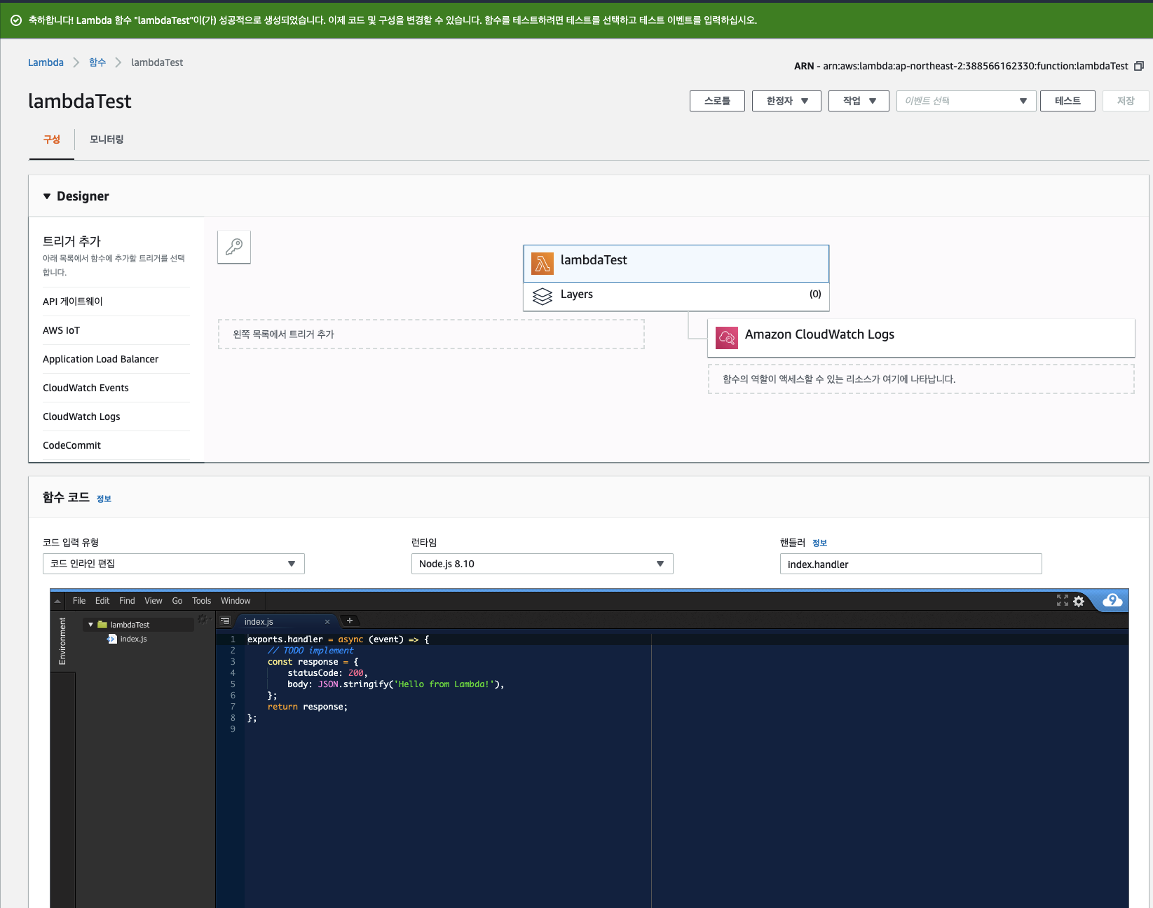 exports.handler = function(event, context, callback) { console.log('remaining time =', context.getRemainingTimeInMillis()); console.log('functionName =', context.functionName); console.log('AWSrequestID =', context.awsRequestId); callback(null, context.functionName); };나머지는 다음 글에서 이어서 작성!
