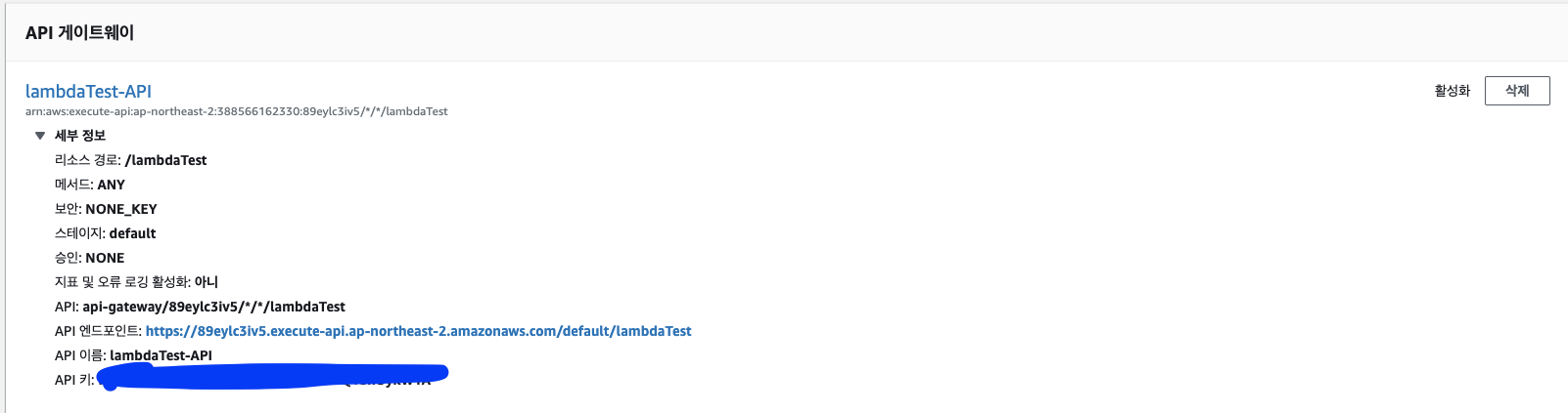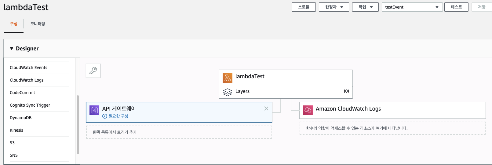 클릭하게 되면 우측과 같이 'lambdaTest' 함수 밑에 'API 게이트웨이' 라는 항목이 생깁니다.
