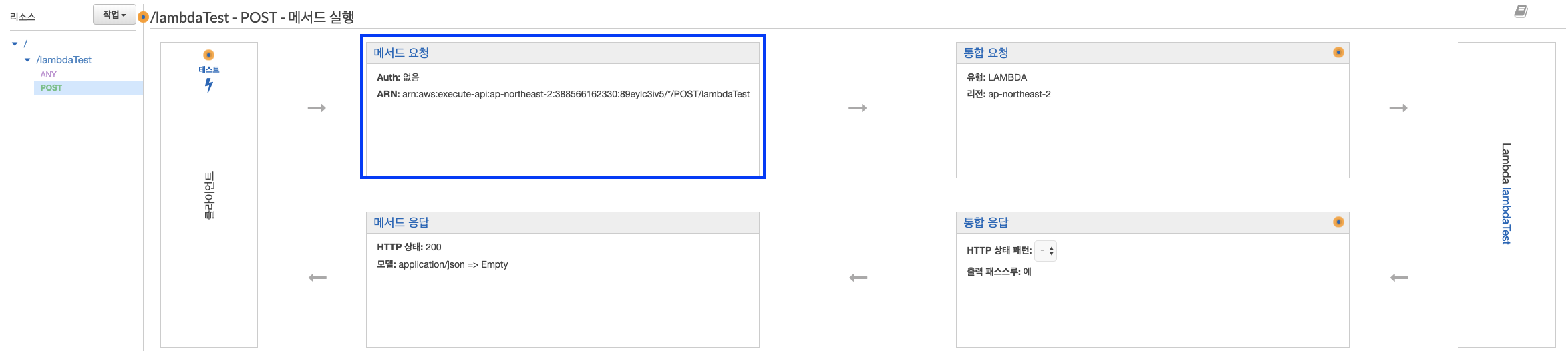 리소스에서 /lambdaTest를 클릭한 뒤 작업에서 메서드 생성을 눌러 POST 메서드를 만들어 줍니다.