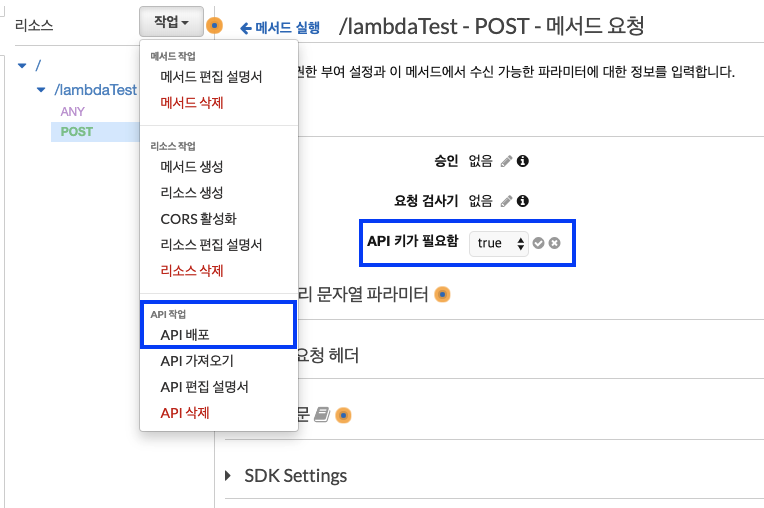 메서드 요청을 클릭한 뒤 보이는 설정에서 'API 키가 필요함' 을 false에서 true 로 변경해줍니다.