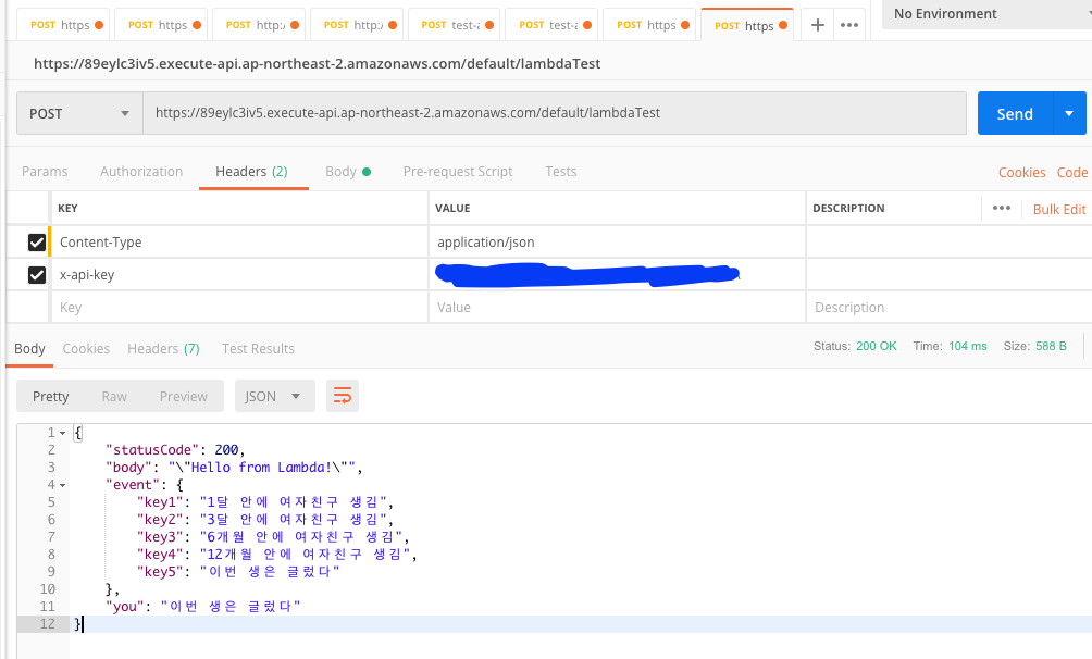 모든 설정을 끝내준 뒤에 Header에 x-api-key라는 이름에 API 키 값을 넣어서 요청하면