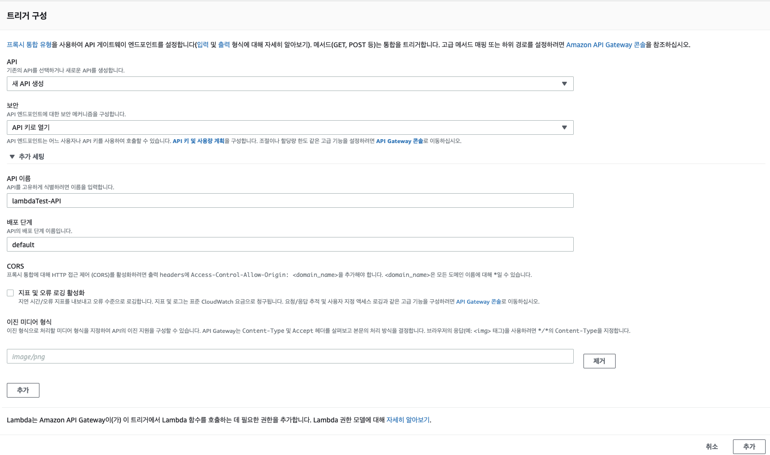 다양한 트리거를 추가할 수 있지만 API gateway 트리거를 추가해보겠습니다.