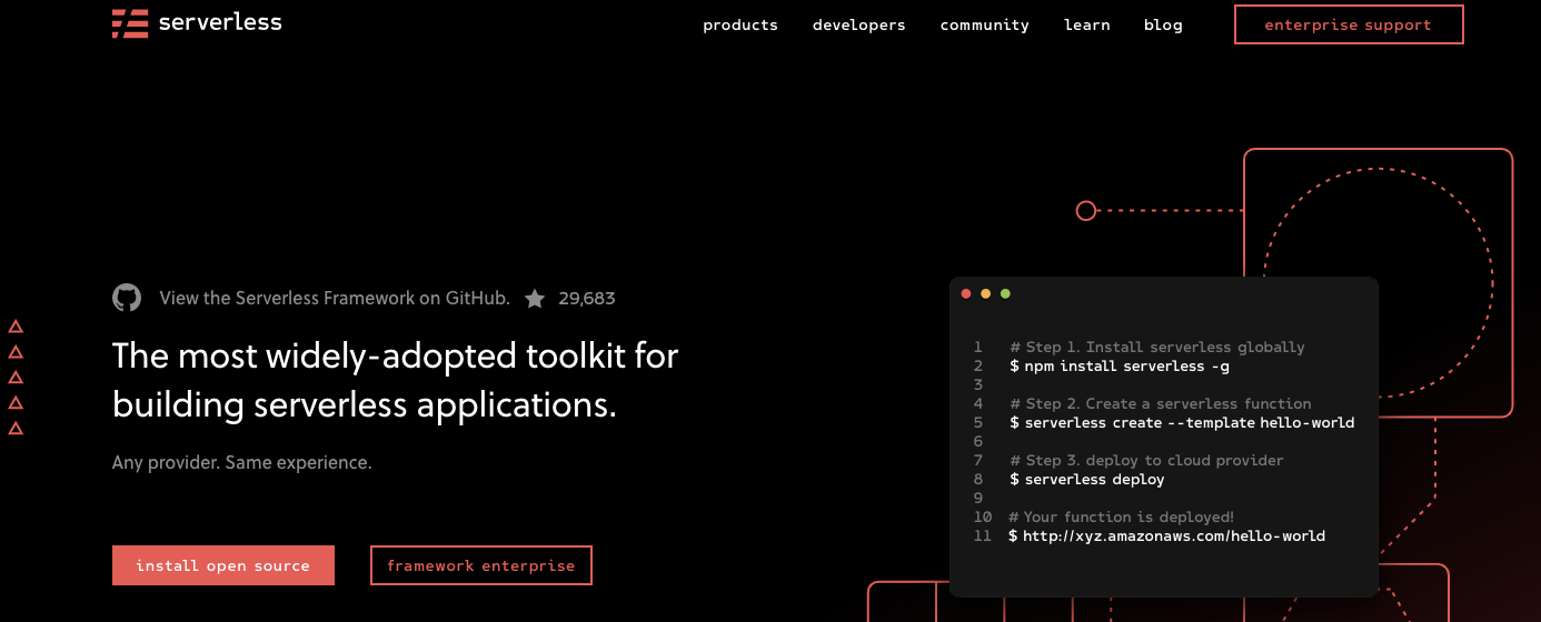 공식 홈페이지인 https://serverless.com/ 에 들어가면 아래와 같은 메인 화면이 보입니다.