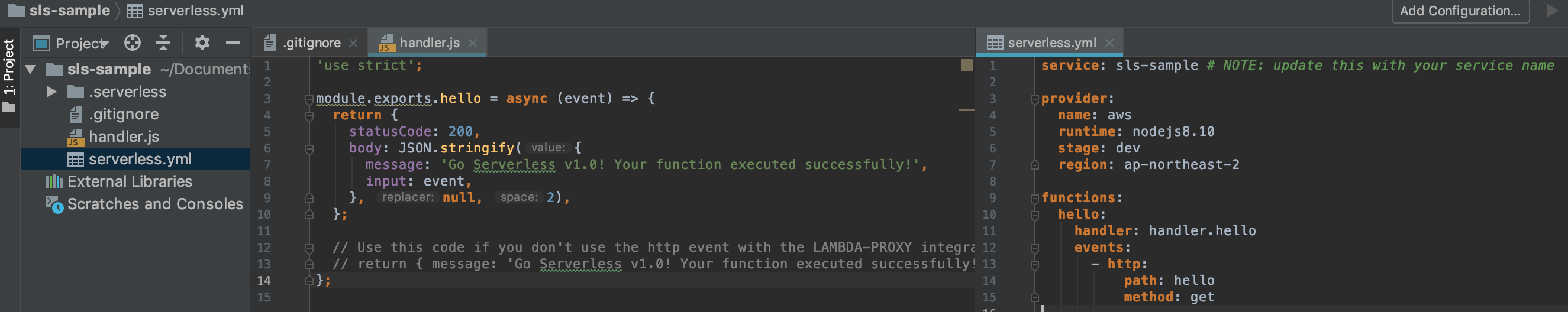 아까 템플릿 생성할 때 생성된 serverless.yml 파일을 수정해줍니다.