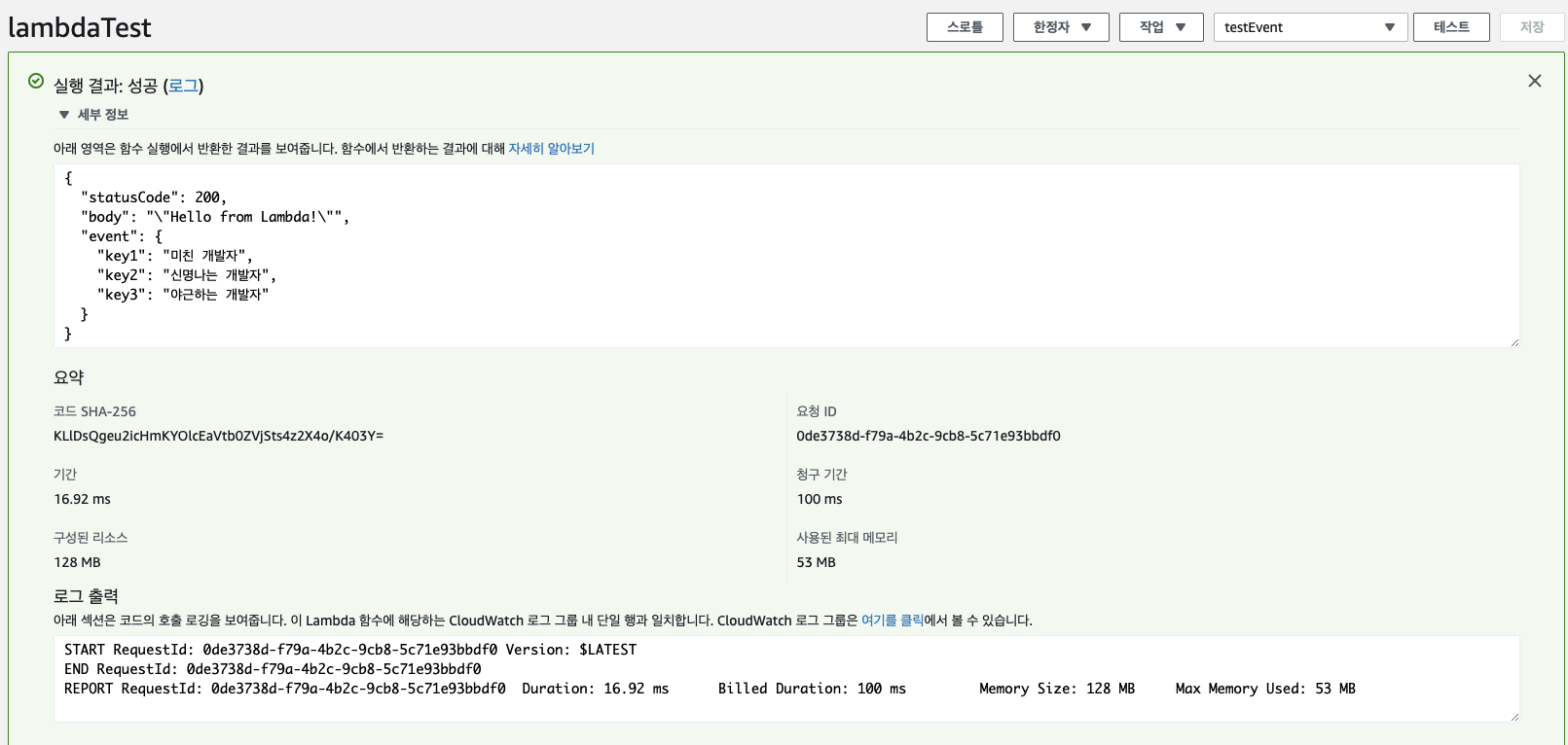 json 형태로 테스트 이벤트 구성을 해보자! 아래와 같이 코드를 작성해봅니다.
