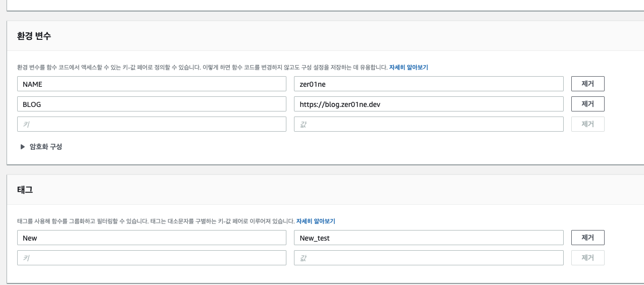 람다에서는 환경 변수와 태그를 구성할 수 있습니다.